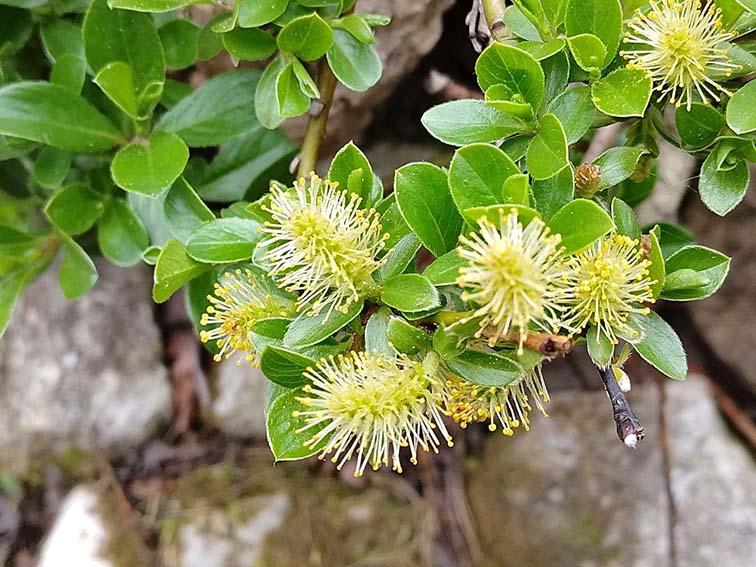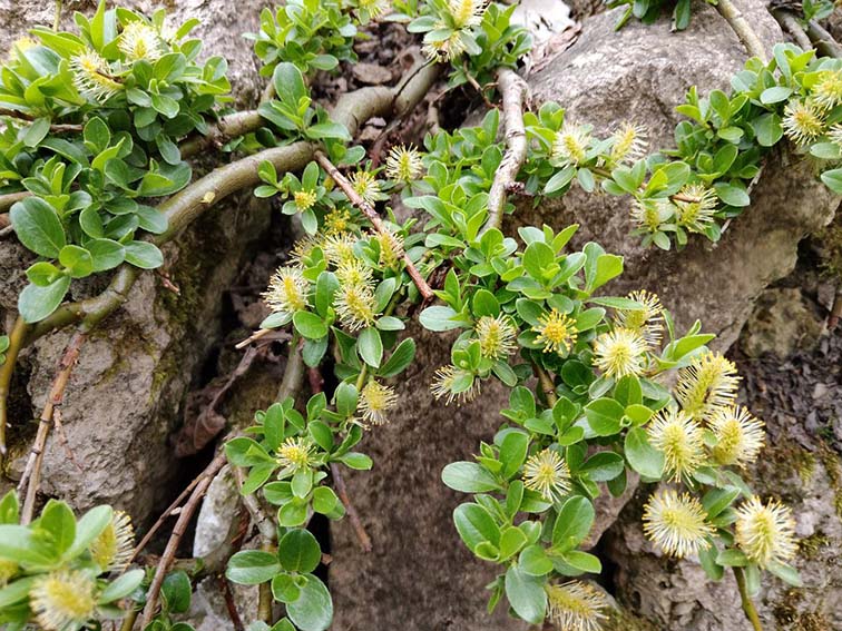 Другое название – ива горная. Растёт в тундре и лесотундре. Изящный сильноветвистый низкий кустарник, высотой 20—80 см. Побеги свисающие, разветвлённые. Листья мелкие, овальной формы, вверху заострённые, блестящие, 1 – 5 см. длиной, по краю городчато-зубчатые, плотные, снизу сизые, с очень четкой сеточкой тонких жилок. Сережки одновременные мужские до 2 см. и женские до 2,5 см. длиной, развиваются в апреле и мае, имеют золотисто-жёлтый цвет. Зимостойкость полная. Растет быстро. Требует ежегодной обрезки после цветения. Используется в одиночных или групповых насаждениях, вблизи водоёмов, в цветниках и рокариях.