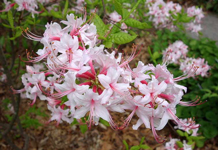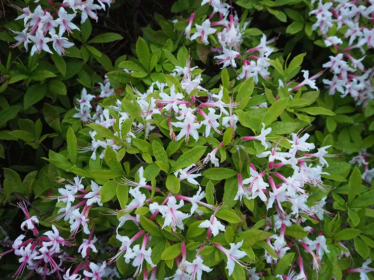Видовой рододендрон. Синоним – Rhododendron nudiflorum. Листопадный кустарник родом из Северной Америки, высотой около 1,0 м. и диаметром кроны 1,2 м.. Кора темно-серая. Листья продолговатые до 11 см. длиной , по краю с ресничками, ярко-зеленые, на коротких черешках. Цветение в мае, около трех недель. Цветки светло-розовые или белые с розовой трубкой, мелкие, 3 – 4 см. в диаметре. Соцветие кистевидное, состоит из 6—15 цветков с сильным запахом, распускающихся до появления листьев или одновременно с ним. Декоративен во время массового цветения и осенью желтыми листьями. Растет медленно, годичный прирост около 5 см. Предпочитает слабокислые, влажные почвы, но в природе растет и на сухих щебнистых почвах. Морозостоек. Подходит для групповых посадок.