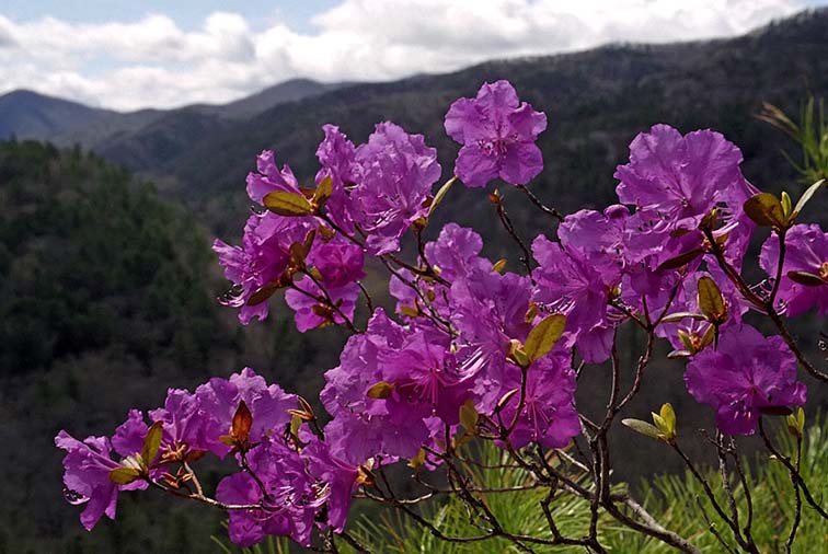 В природе распространен в Забайкалье, Маньчжурии, Северном Китае, Корее, Японии. Растет в подлеске хвойных и широколиственных лесов. Пряморастущий ветвистый кустарник, высотой 1,5 – 2 м.. Листья тонкие, эллиптические, заостренные, блестящие, ярко зеленые, с чешуйками с обеих сторон, частично опадают на зиму. Цветки до 5 см. в диаметре, пурпурово – розовые, собранные по 3 – 6 шт. на концах побегов. Цветение проходит до распускания листьев. Цветёт в конце апреля – мае, особенно интенсивно на ветвях, перезимовавших под снегом. Продолжительность цветения две – три недели. Листья появляются после цветения, обычно во второй половине мая. Листопад начинается с середины сентября, часть листьев иногда сохраняется до весны. Хорошо смотрится в одиночных и групповых посадках, в подлеске изреженных насаждений сосен и берез. Некоторые систематики считают рододендрон остроконечный подвидом рододендрона даурского.