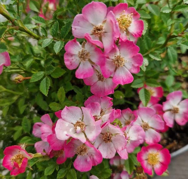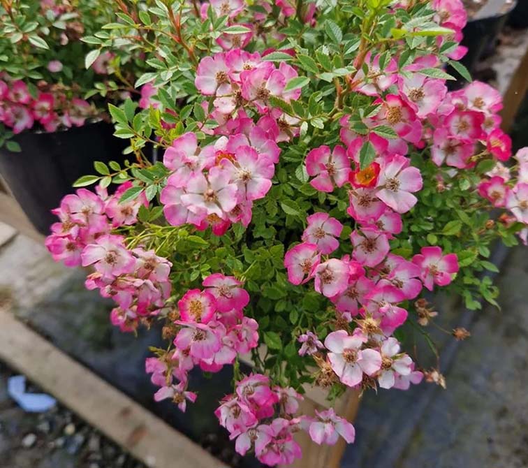 Кустарник с очень плотной, похожей на подушку формой. Вырастает всего до 15 см. в высоту и 30 – 50 см. в ширину. Побеги без шипов. Цветет обильно миниатюрными белыми и розовыми цветками из пяти округлых лепестков, окружающих желтый центр с тычинками. Цветение непрерывное весь сезон. Не завязывает плодов. Зимостойка, неприхотлива, нетребовательна в уходе. Не нуждается в обрезке. Хорошо растет на умеренно влажных плодородных дренированных почвах, на солнечных местах. Подходит для посадки в альпинариях, в качестве почвопокровного растения, выращивания в контейнерах.
